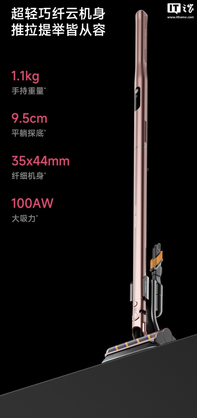 据介绍,该产品重量 1.1 千克,平躺时高度约 9.5 厘米。吸尘器头支持 360 度灵活扭转,同时配备绿光以显示尘埃。