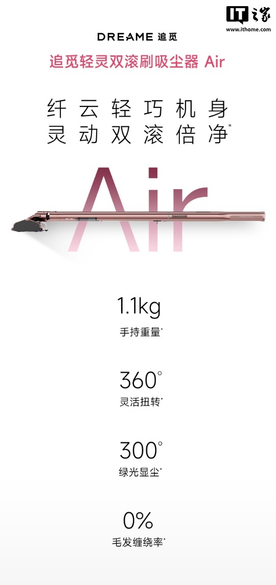 IT之家 3 月 17 日消息,追觅现已在京东上架“轻灵双滚刷吸尘器 Air”,其主打 1.1 千克手持重量,提供 360 度灵活扭转,商品页显示预售价为 1499 元。