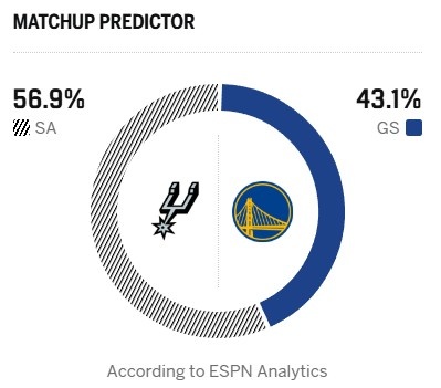 今天ESPN晒出本场胜率预测,马刺为56.9%,勇士为43.1%。